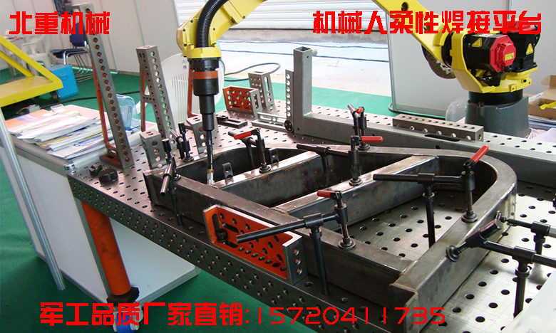 柔性組合工裝夾具是一種三維平面孔系定位夾緊系統(tǒng),采用標(biāo)準(zhǔn)化、系列化、通用化的模塊組成,所有模塊的鏈接、固定和壓緊都是以孔來(lái)定位,用鎖緊銷來(lái)實(shí)現(xiàn)快速鎖緊,模塊與模塊隨著機(jī)器人的應(yīng)用越來(lái)越廣泛,自動(dòng)化程度的不斷提高,傳統(tǒng)的裝配、焊接工藝裝備已經(jīng)很難適應(yīng)生產(chǎn)的要求;經(jīng)過(guò)我們不斷的實(shí)驗(yàn)創(chuàng)新,研發(fā)出機(jī)器人焊接平臺(tái),從此提高生產(chǎn)效率、降低生產(chǎn)成本、提高產(chǎn)品質(zhì)量。利用專用夾具附件完成實(shí)現(xiàn)產(chǎn)品的高效率、低成本的生產(chǎn)。